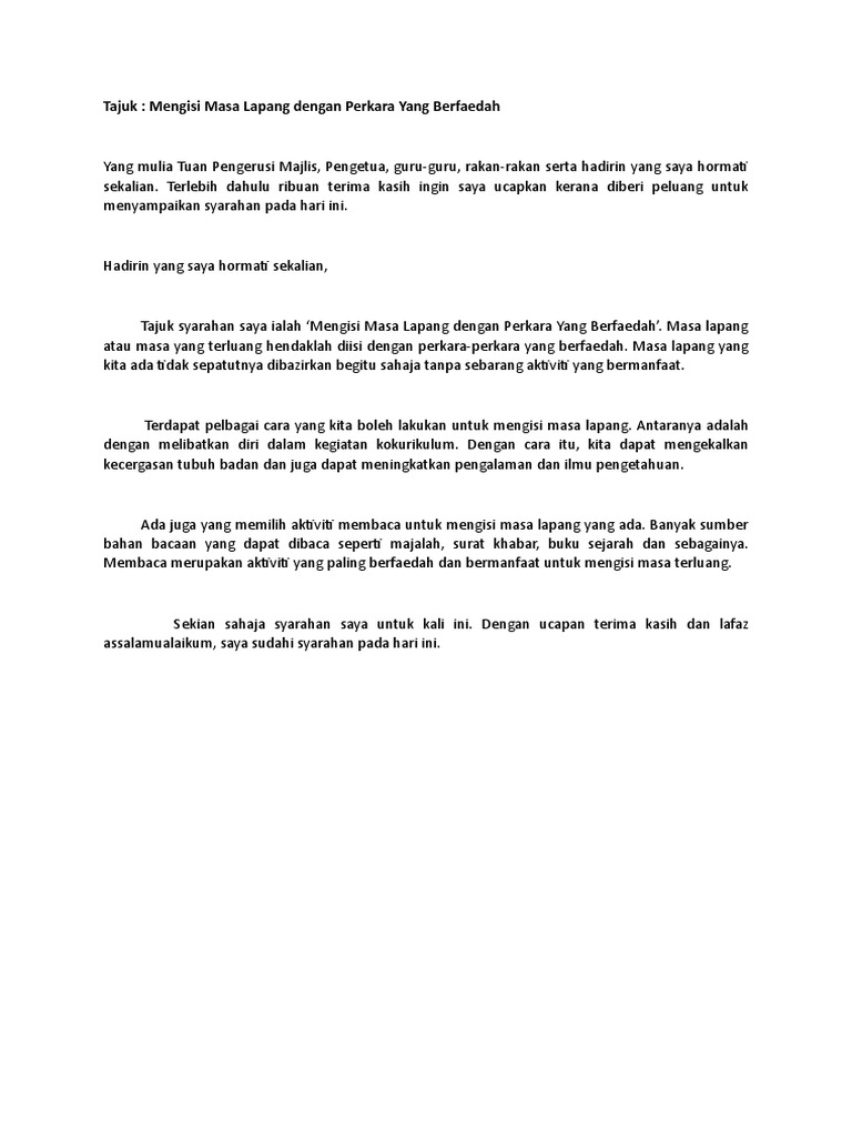 Yang dihormati dan disanjungi Tuan Pengerusi Majlis Para Hakim yang arif dan bijaksana Tuan Pengetua guru-guru rakan-rakan dan hadirin hadirat sekalian. Pada masa lapang kita juga boleh membantu ibu membuat kerja-kerja rumah seperti mencuci pakaian. Masa lapang perlu dimanfaatkan dengan aktiviti yang berfaedah seperti bersukan supaya dapat menghindarkan diri daripada melakukan perkara-perkara yang tidak bermoral dan membuang masa.